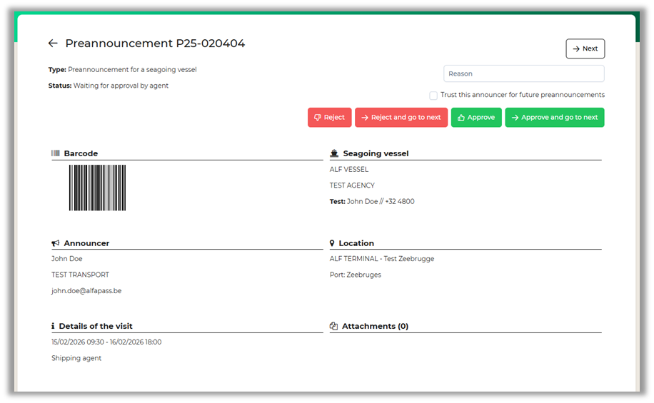 You can approve or reject preannouncements for visitors of vessels handled by your agency. You will receive an approval e-mail for these preannouncements on the e-mail address(es) or email-group(s) configured by Alfapass. There is a link in the mail that will redirect you to the Prean to evaluate the preannouncement.