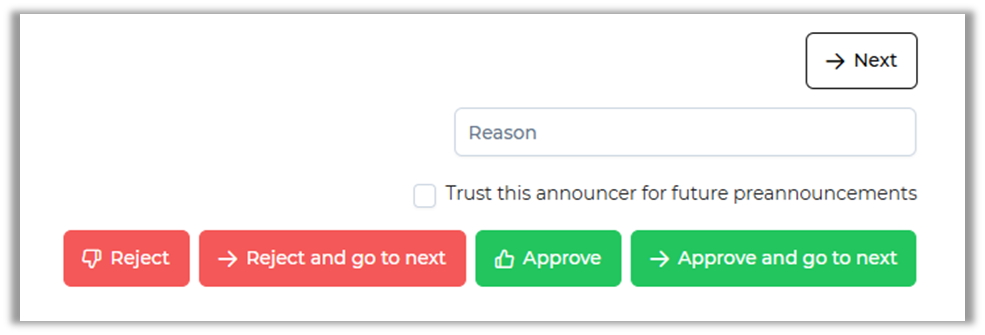 Keep in mind that when rejecting a preannouncement, the reason will be required.