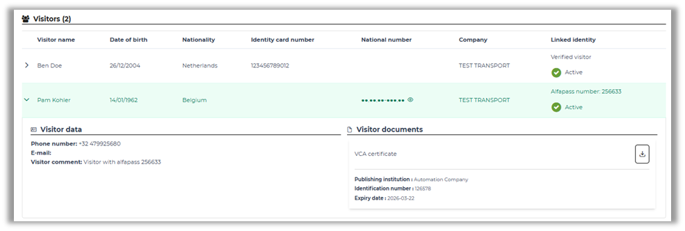 You can receive more information about the visitor by clicking on the row. Some terminals require specific certification or official documents to allow access. Whenever a visitor is in possession of these documents, they can be downloaded here.