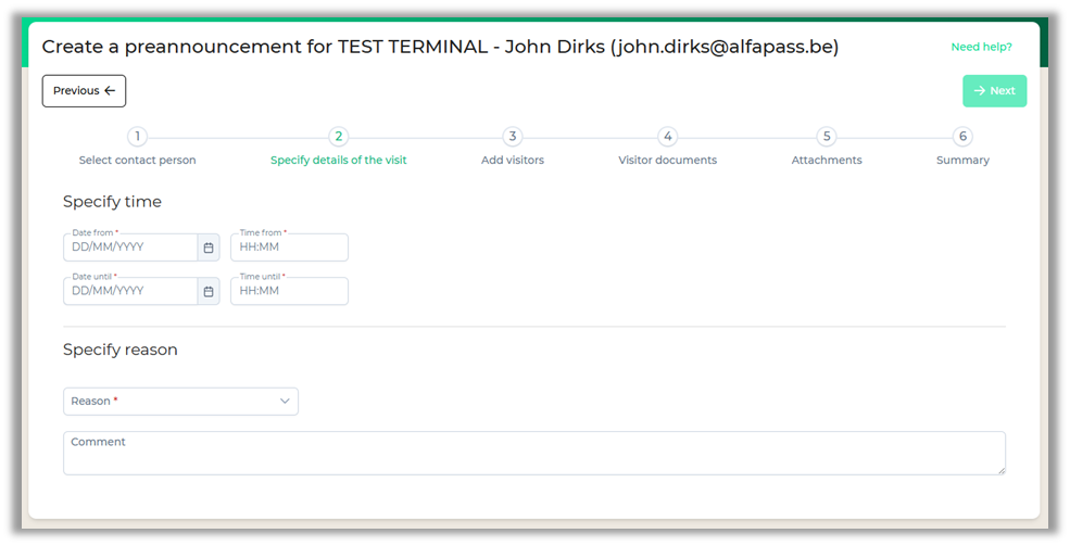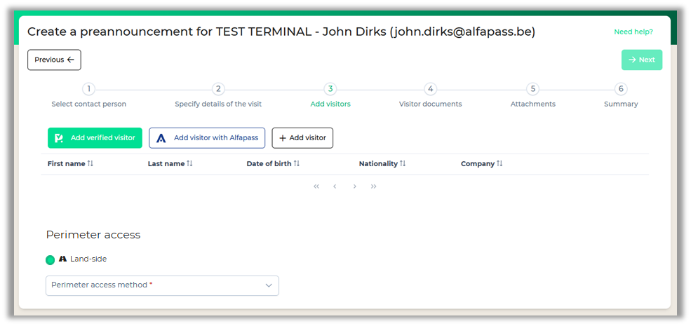 If the terminal allows the creation of a preannouncement with reference, you'll notice that the 'Next' button in Step 3 is enabled without having any visitors defined. This can be used when the identity of the visitor is yet to be determined at the time of creation.