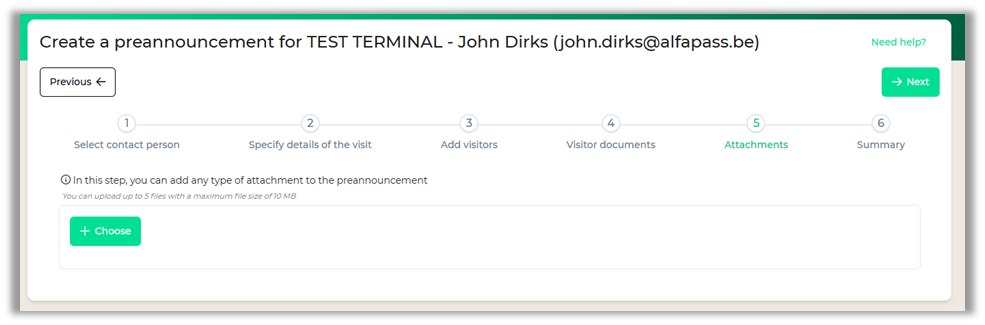 You can (optionally) add up to 5 attachments to the preannouncement with a maximum of 10MB. In case you would like to add a document that was not listed in the previous step or if the terminal asked for any other documents in the notices.