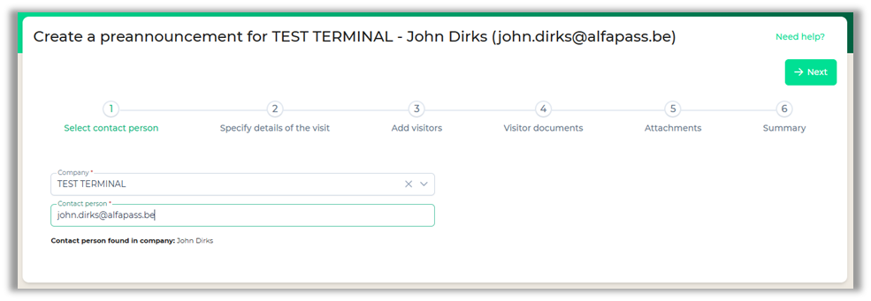 By selecting the Company and adding Contact person, the “Next” button will be enabled.