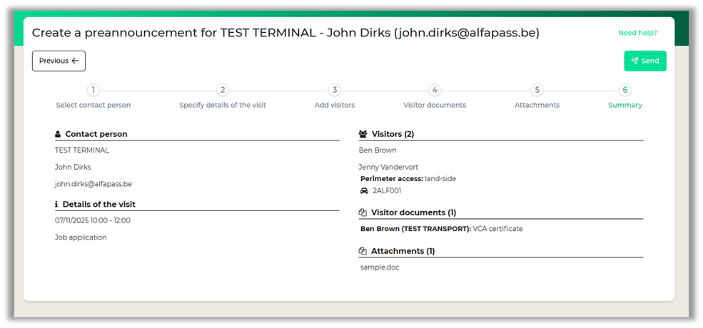 In the last step you will receive an overview of all the information entered. At this point it is still possible to return to previous steps and adjust the preannouncement before sending.