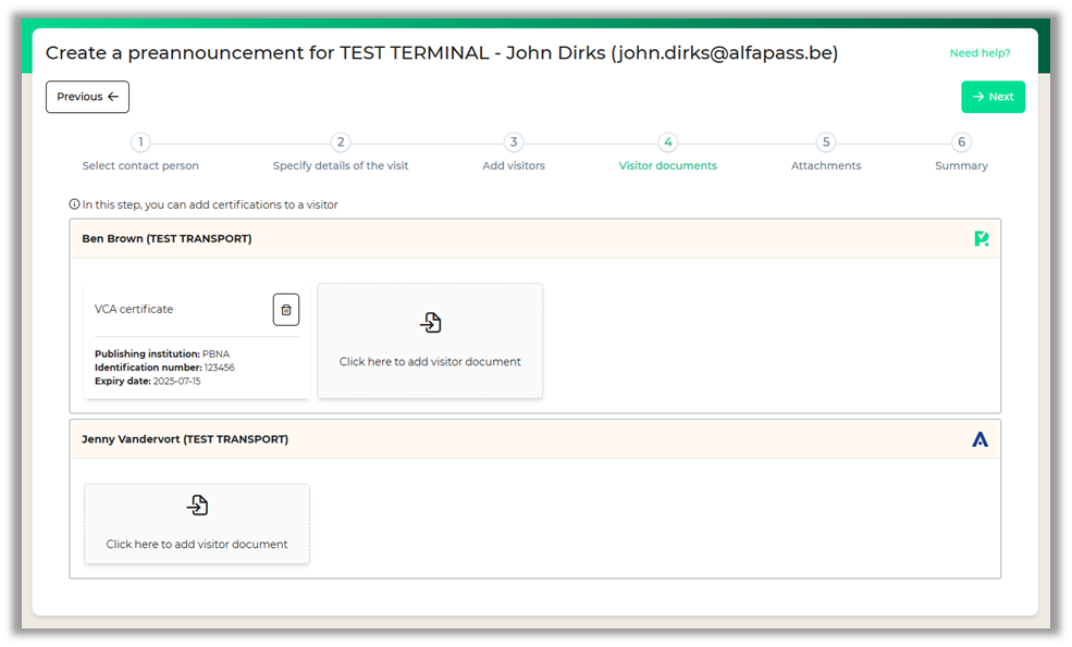 Some terminals require official documents or certificates to ensure that a visitor is compliant with certain standards. In this step of the process, documents can be added to each visitor.