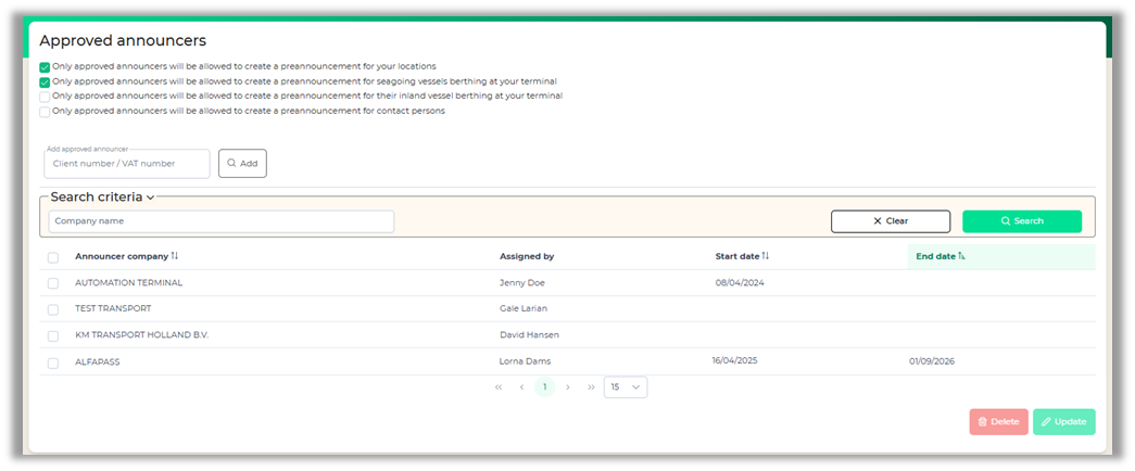 Please note: If you enter an end date, the company will no longer be able to create preannouncements for your location/terminal after this date.