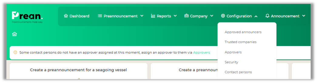 This feature prevents companies from registering visitors at a location without a partnership agreement. Customers using this functionality for their locations are not visible to visiting companies if they are not included in the list of approved announcers. This functionality is only available with the "Admin" role. In the Prean web application, you can find the "Configuration" option at the top of the menu.