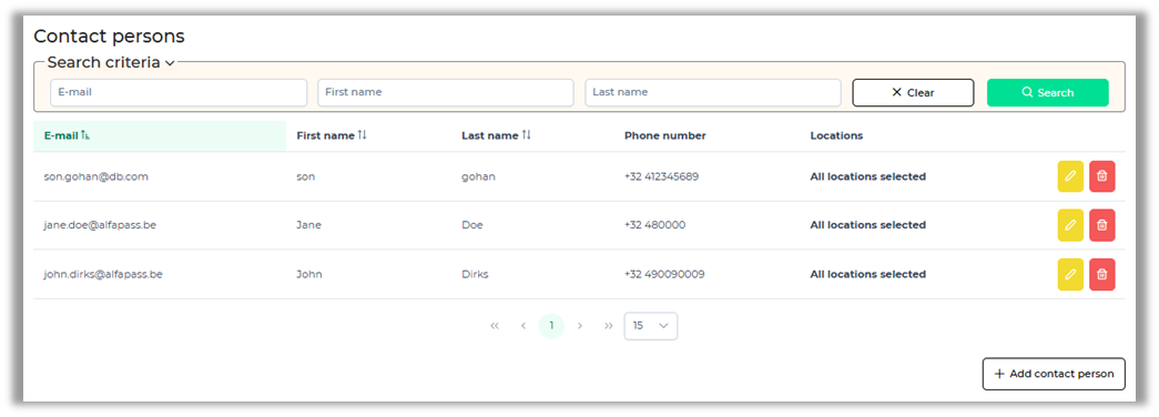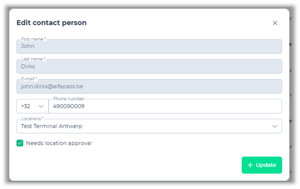 Click the ‘Add contact person’ to add a new contact person. Fill in the required fields and optionally a phone number. From the Location dropdown list, please select the ones you wish to link to this contact person.