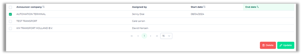Update allows you to edit the dates. If you select more than one company for an update, the new date will be displayed on the screen. For example, if you only enter an end date, only the end date will appear in the overview; the previous start date will no longer be visible.