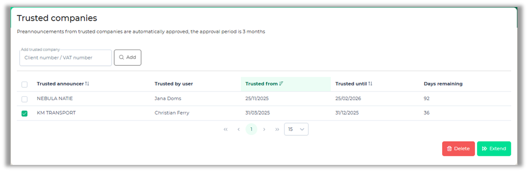 This overview shows all the companies you've trusted. You can see who trusted these companies and when. The "Days Remaining" column lets you easily see how many days a company has been trusted.