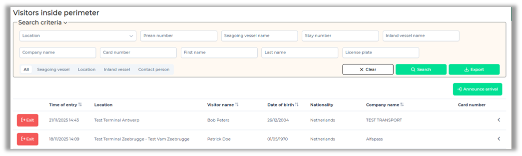 This screen provides an overview of the visitors currently registered within the perimeter. Several fields are available to identify a visitor. You can mark visitors as "departed" by clicking the "Exit" button. Clicking the "Export" button downloads a PDF with an overview of all visitors currently within the perimeter.