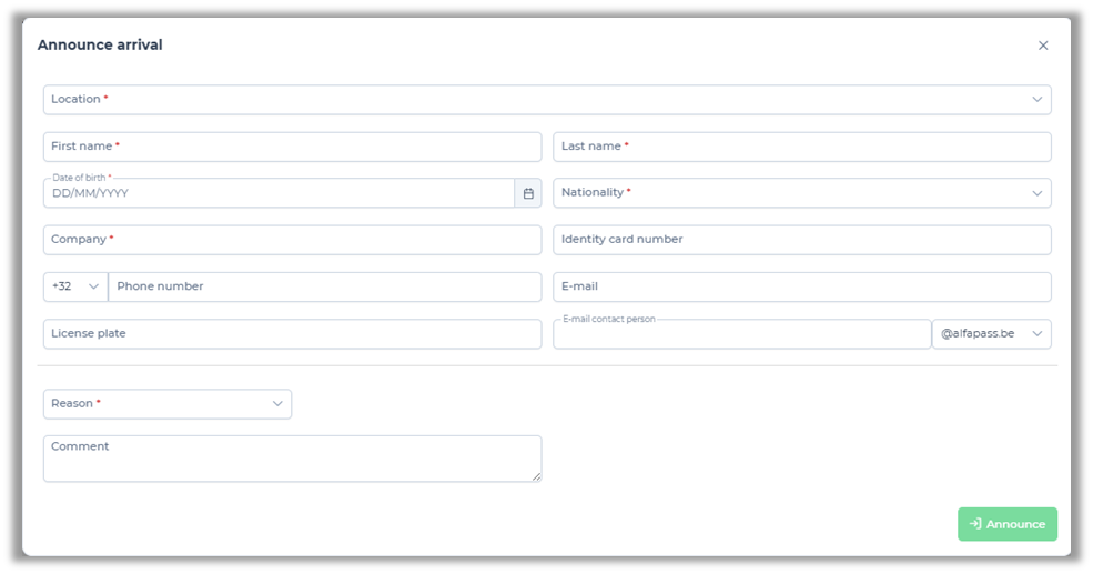 Also, on the same page you will find the "Announce arrival" button. This button is available when it is allowed to register visitors who are not linked to a preannouncement.
