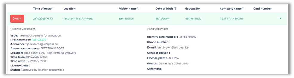 When you click on a row, you will see more information about the visitor and the preannouncement (if one exists).