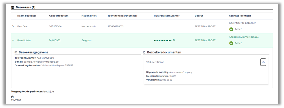 Bij het klikken op een bezoeker krijgt u meer informatie over de persoon te zien. Sommige terminals vereisen het bezit van certificaten of officiële documenten om een locatie te mogen betreden. Als een bezoeker over deze documenten beschikt, kunnen ze ook hier worden geraadpleegd.