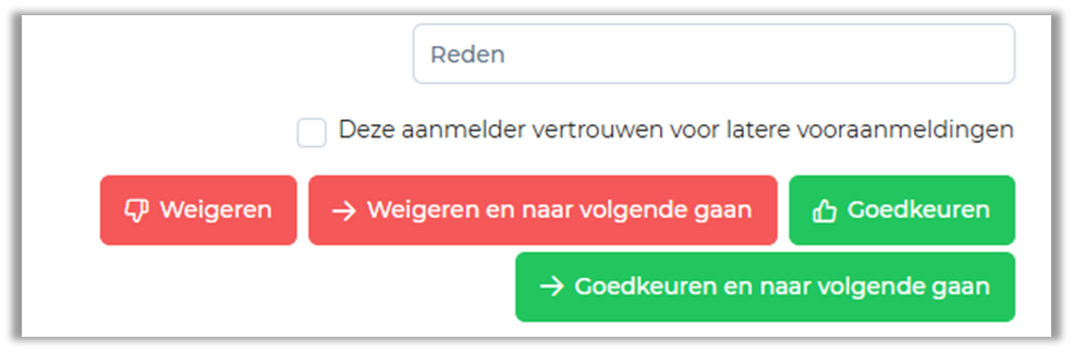 Er zullen vier knoppen beschikbaar zijn bovenaan de pagina (er zijn slechts twee knoppen als dit de enige vooraankondiging in de lijst is). De volgende acties kunnen worden uitgevoerd: Weigeren, weigeren en naar de volgende gaan, goedkeuren, goedkeuren en naar de volgende gaan.