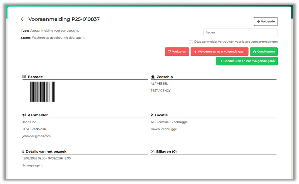Dit opent een meer gedetailleerd beeld van de vooraanmelding en bevat de informatie over het vaartuig, de aanmelder, locatie en details van het bezoek.