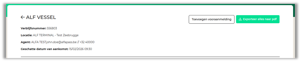 Door op een van de schepen te klikken, ziet u gedetailleerde informatie over het schip, het agentschap, contacten en de vooraf gemaakte aankondigingen. Klik op de knop "exporteren" om een pdf-bestand te downloaden met alle informatie en bezoeken, gegroepeerd op reden.