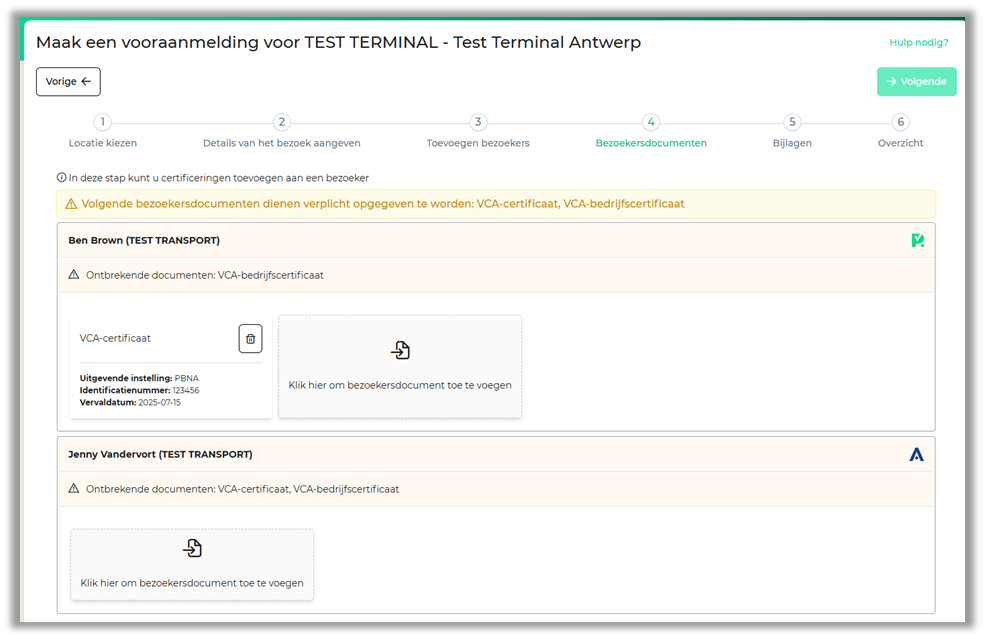 Wanneer je gebruik maakt van een geverifieerde bezoeker kan het zijn dat deze documenten al in het bezoekersprofiel zijn toegevoegd en verschijnen deze automatisch in deze stap.