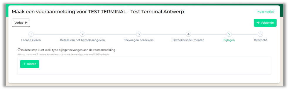 Je kan (optioneel) tot 5 bestanden toevoegen aan de vooraanmelding met een maximum van 10MB. Hier kan bestanden uploaden die in de vorige stap niet opgelijst stonden of als de terminal hierom vroeg in de mededelingen.