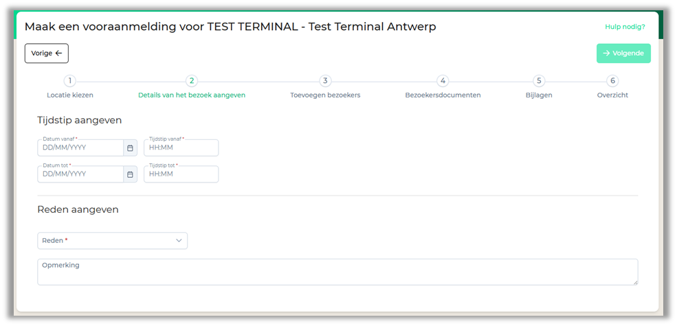 Specifieer de datum en het tijdstip van de verwachte aankomst en het vertrek. Selecteer een reden voor het bezoek uit de drop-down en laat indien gewenst een opmerking achter. Deze velden kunnen op vraag van de terminal verplicht zijn.