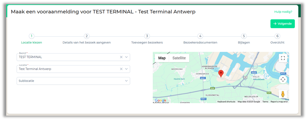 Door het bedrijf en de locatie te selecteren, wordt de knop “Volgende” geactiveerd. Er verschijnt een kaart met de locatie.