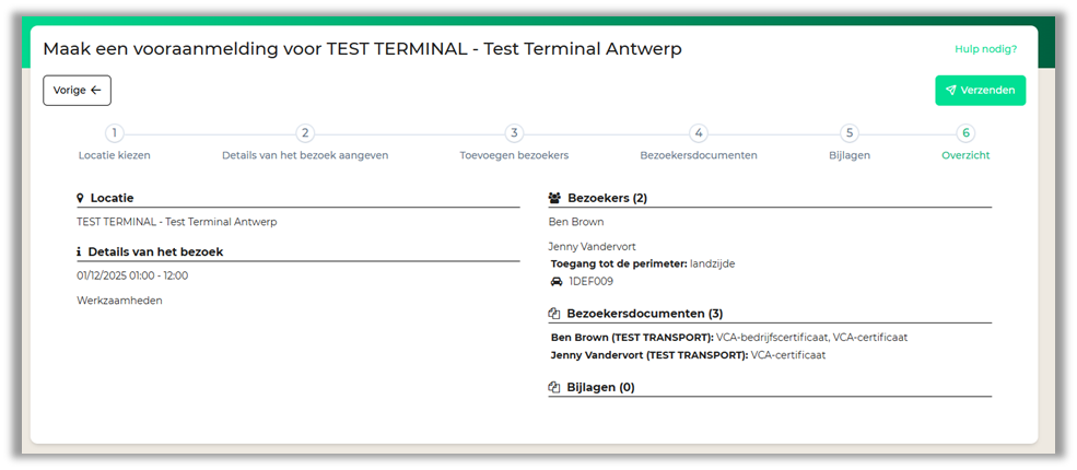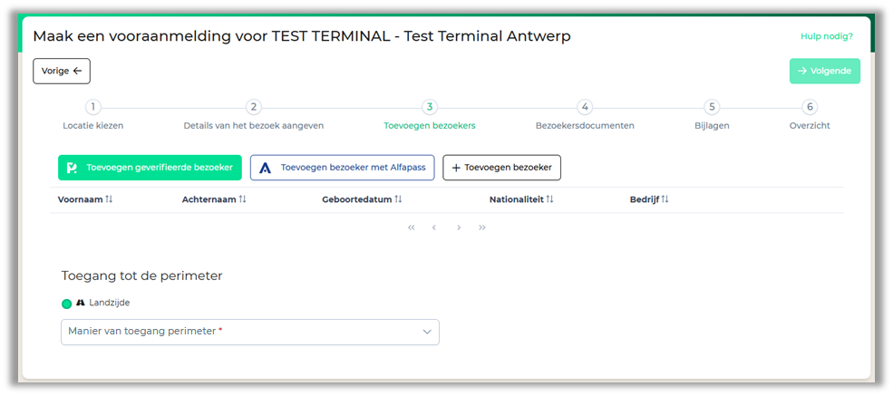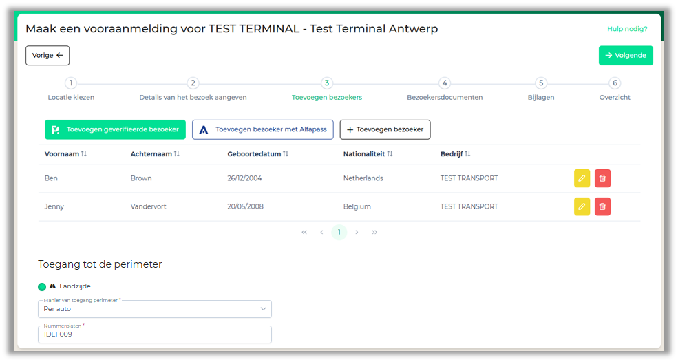 Na het toevoegen van de bezoekers, kunnen deze via het overzicht nog steeds bewerkt of verwijderd worden. Ook kan op deze pagina de manier van toegang tot de perimeter en een nummerplaat worden ingevoerd. Meerdere nummerplaten zijn mogelijk als deze door een ‘ ; ‘ gescheiden worden.