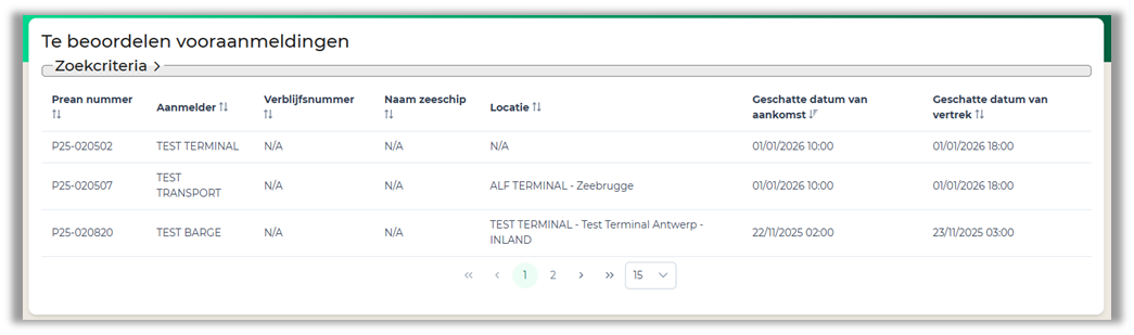 Goed- of afkeuren van vooraanmeldingen kan gedaan worden door te klikken op de ‘Te beoordelen vooraanmeldingen’ knop. In dit overzicht kan je het detail van een vooraanmelding raadplegen door de rij te selecteren van de vooraanmelding die je wilt beoordelen.